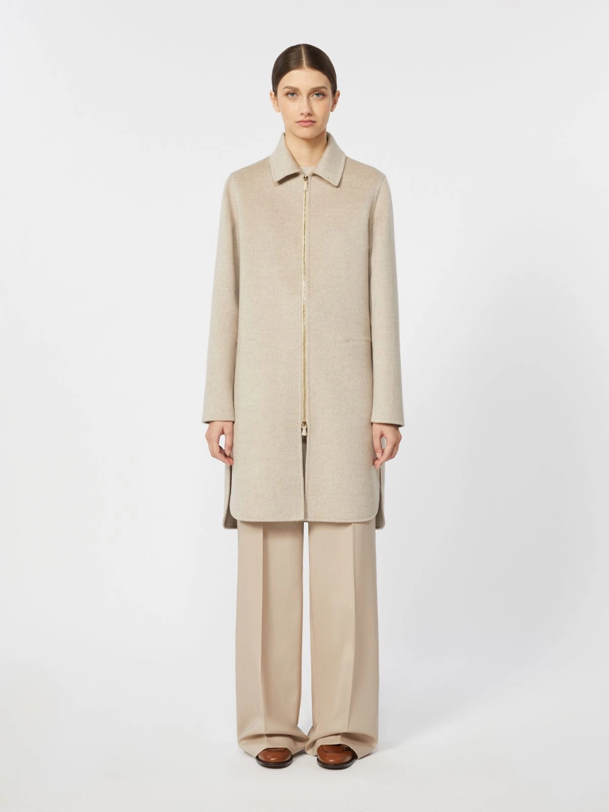 - Cappotto in doppio di puro cachemire, cucito a mano, con finitura opaca