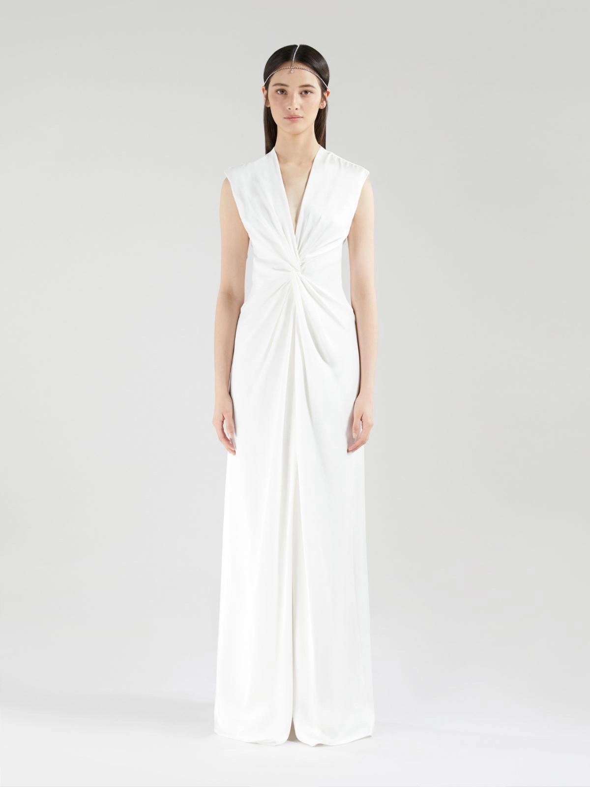 Abito lungo smanicato, caratterizzato da motivo drappeggiato in vita sul davanti, che evidenzia la silhouette.