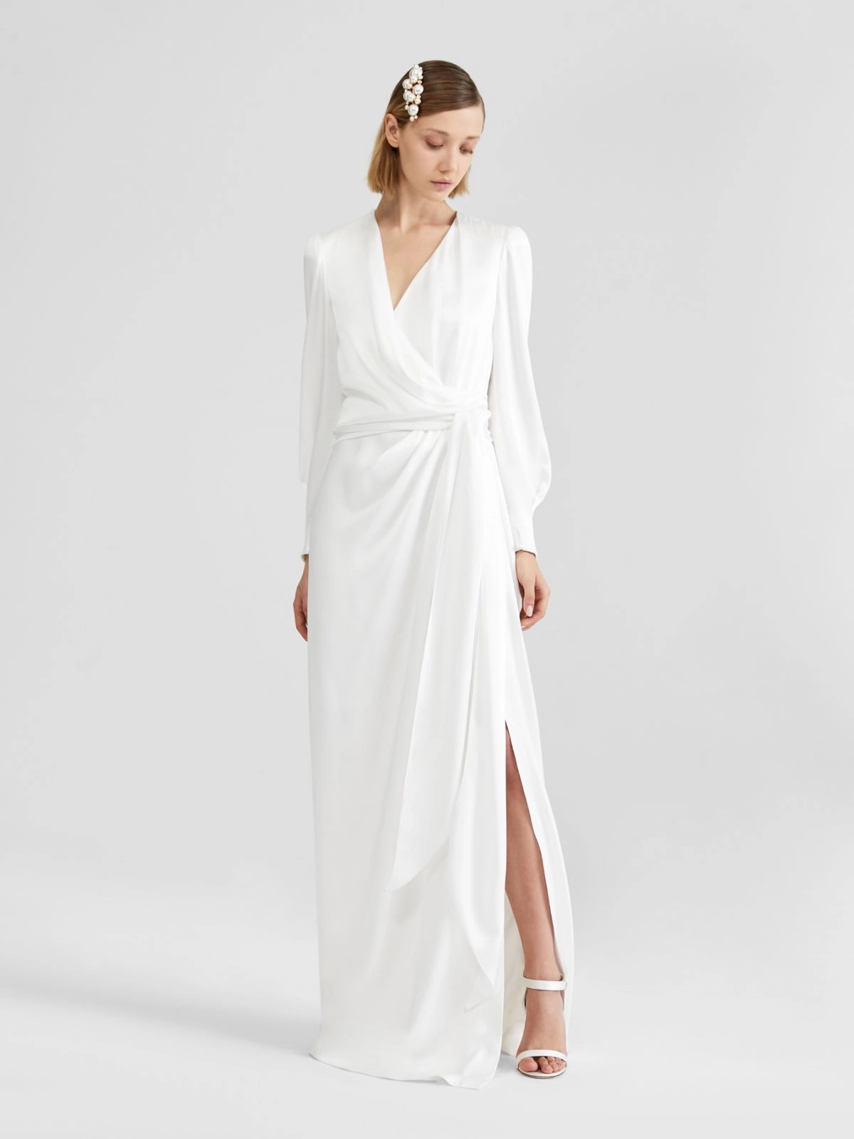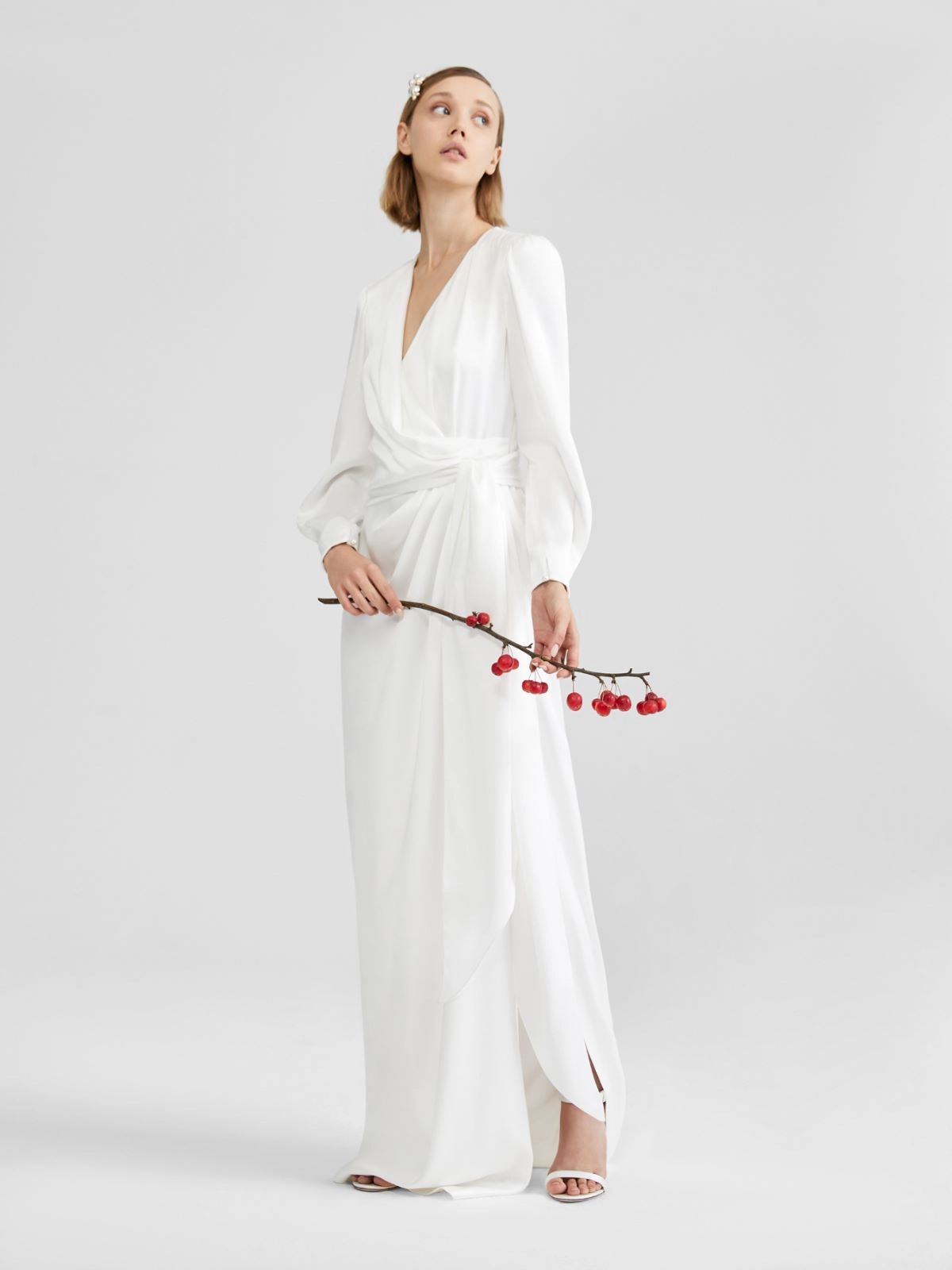 Abito lungo a portafoglio, caratterizzato da una silhouette drappeggiata con motivo raccolto sul fianco.