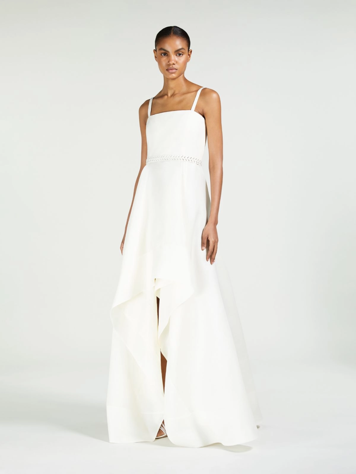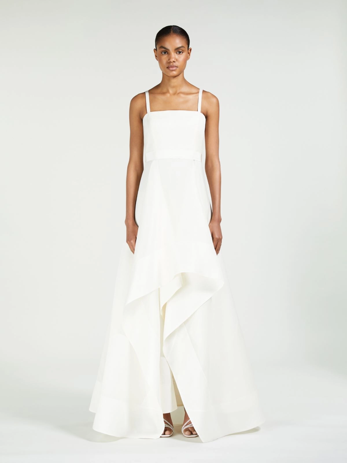 Abito lungo smanicato, caratterizzato da ampia gonna asimmetrica con motivo drappeggiato più corto sul davanti e leggera coda sul retro.