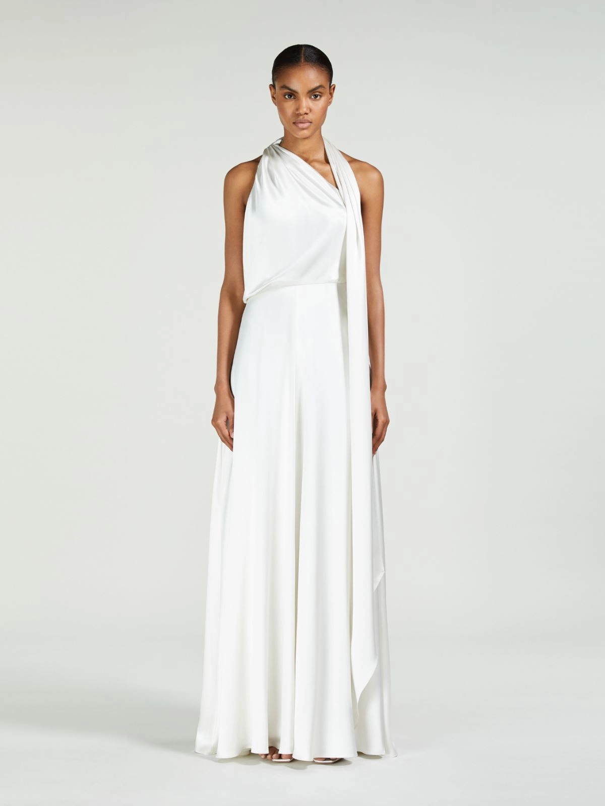 Abito lungo monospalla, caratterizzato da una lunga fusciacca sulla spalla sinistra che può essere indossata drappeggiata sul braccio, sciolta sulla schiena o intorno al collo per creare styling differenti.