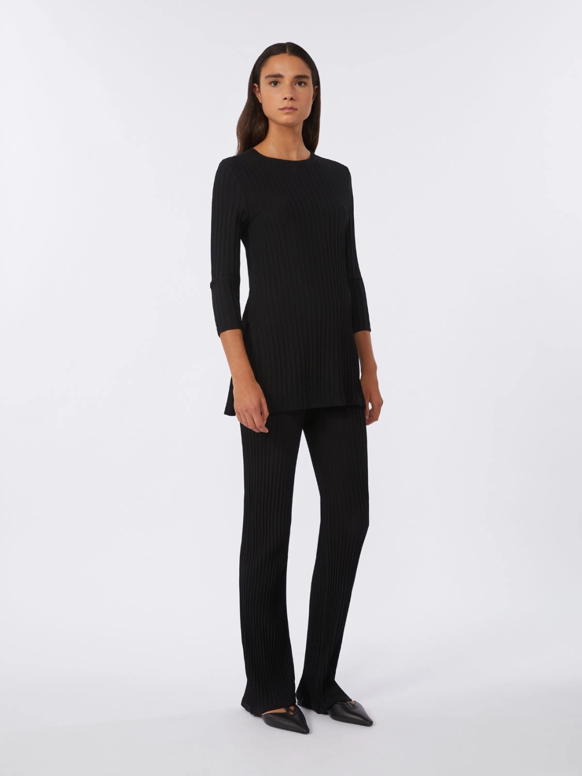 Maglia girocollo, caratterizzata da una lavorazione a coste d'ispirazione plissé.