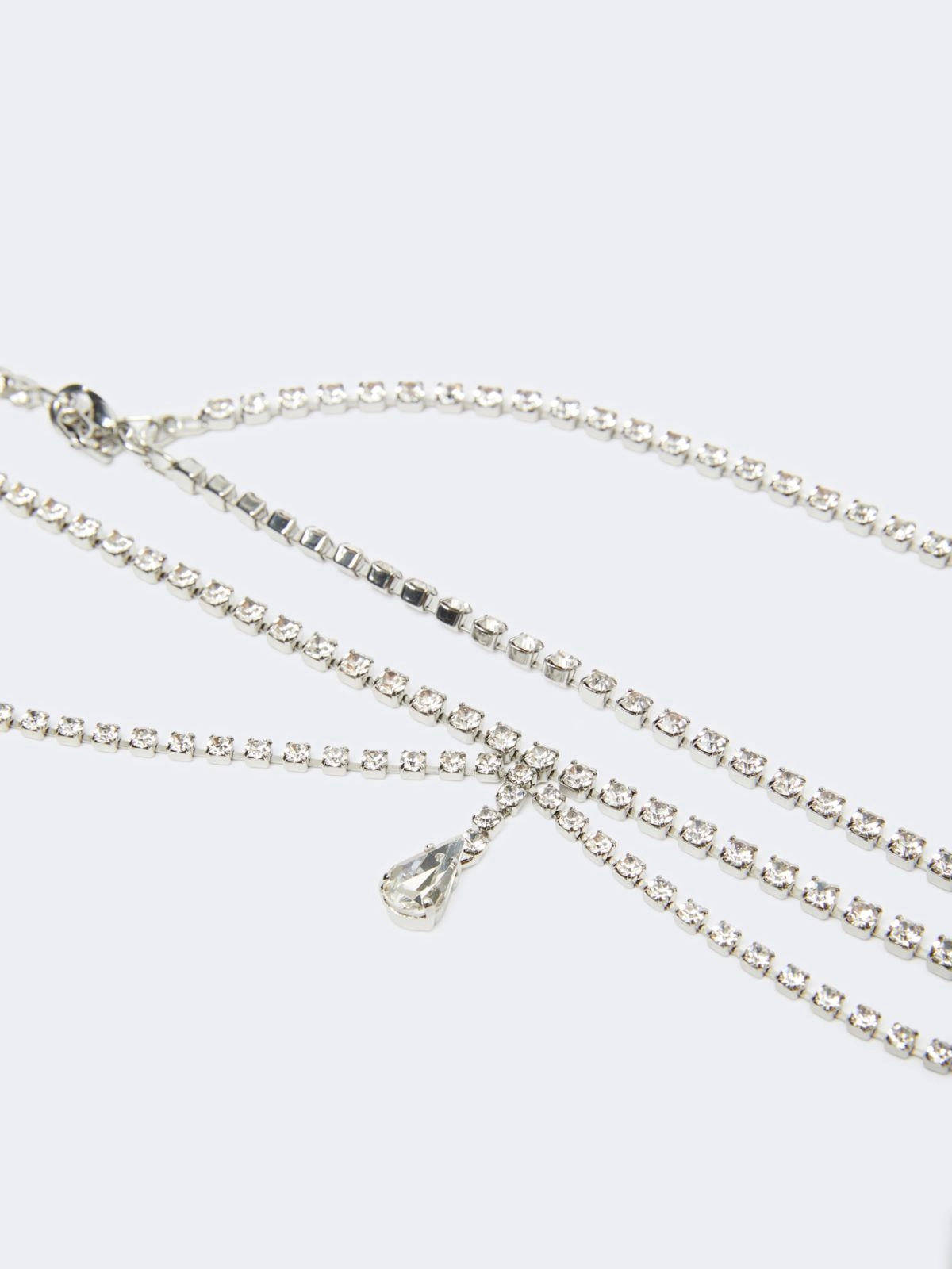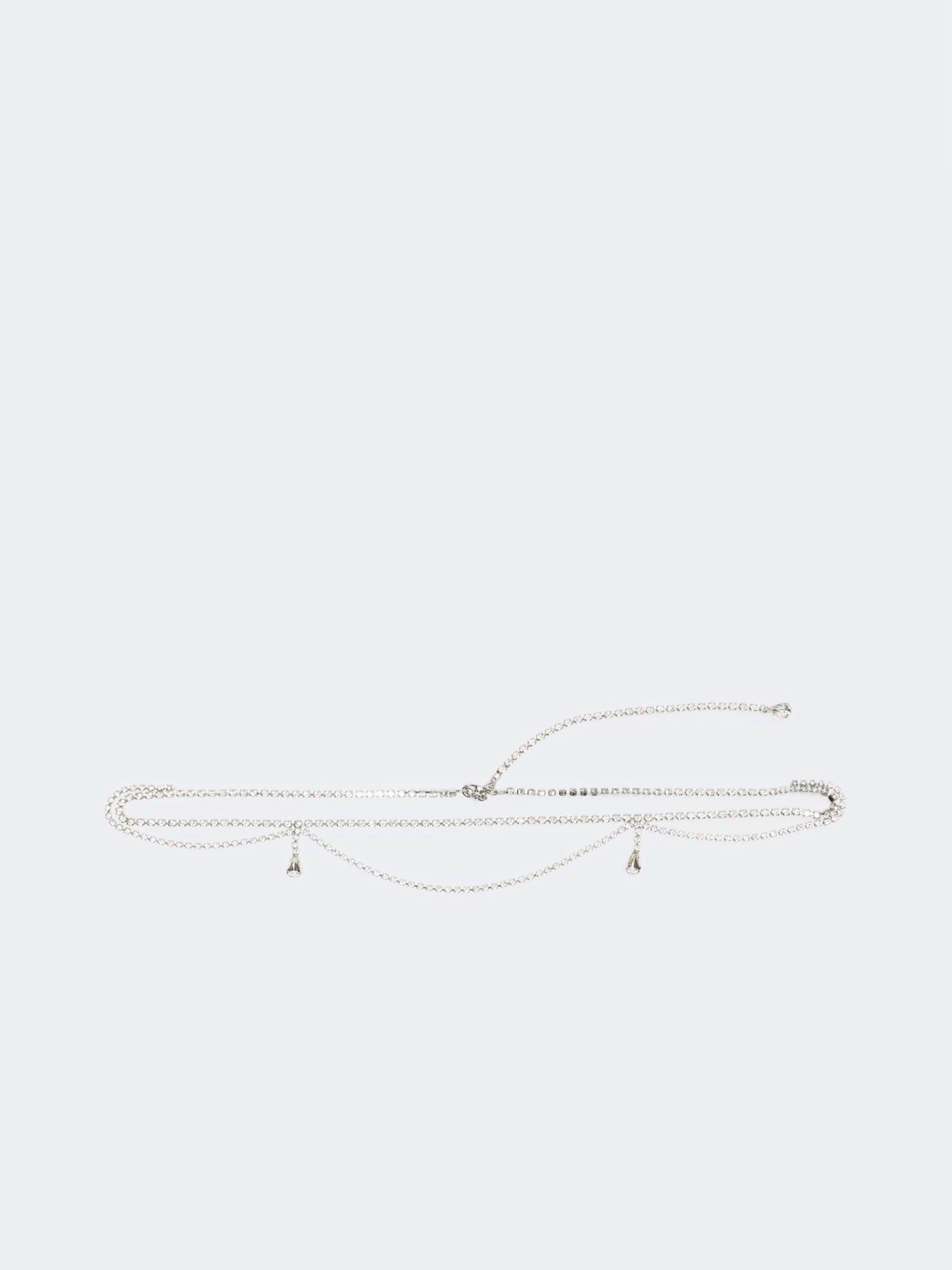 Cintura gioiello composta da una sottile doppia catena con piccole gocce pendenti sul davanti.