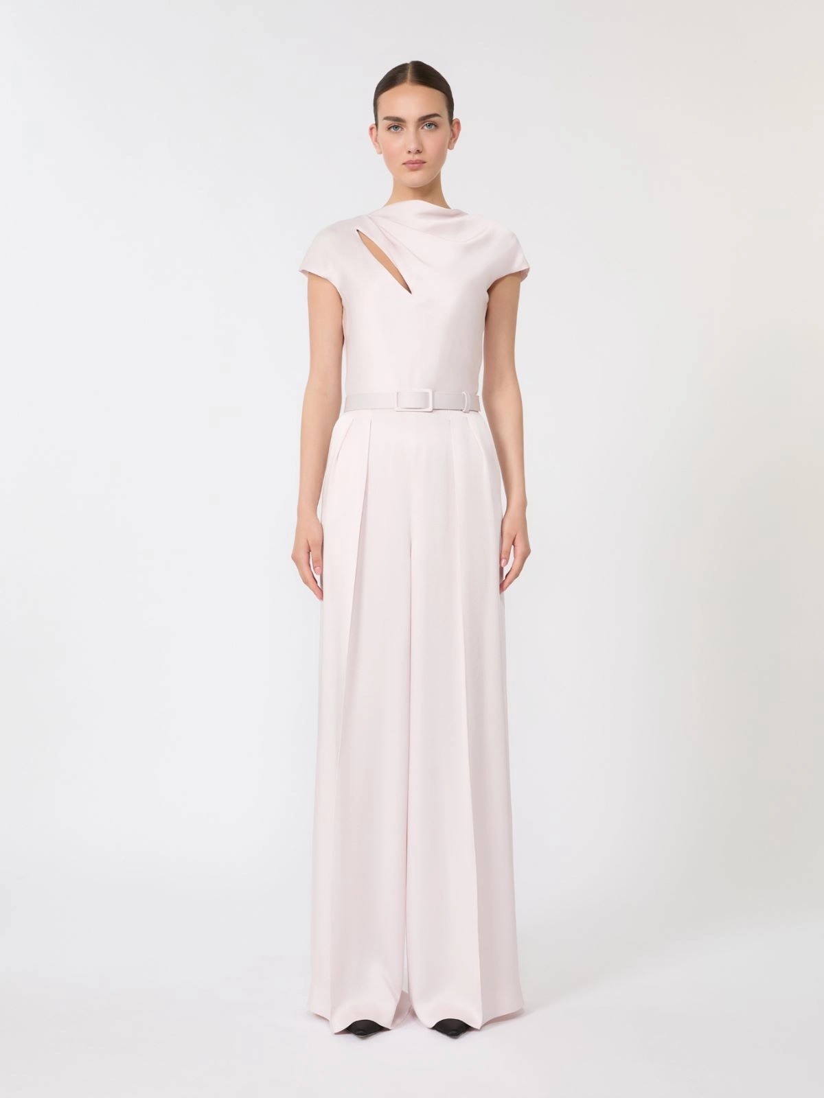 Tuta smanicata con pantalone ampio e corpetto drappeggiato con dettaglio cut-out obliquo sul davanti.