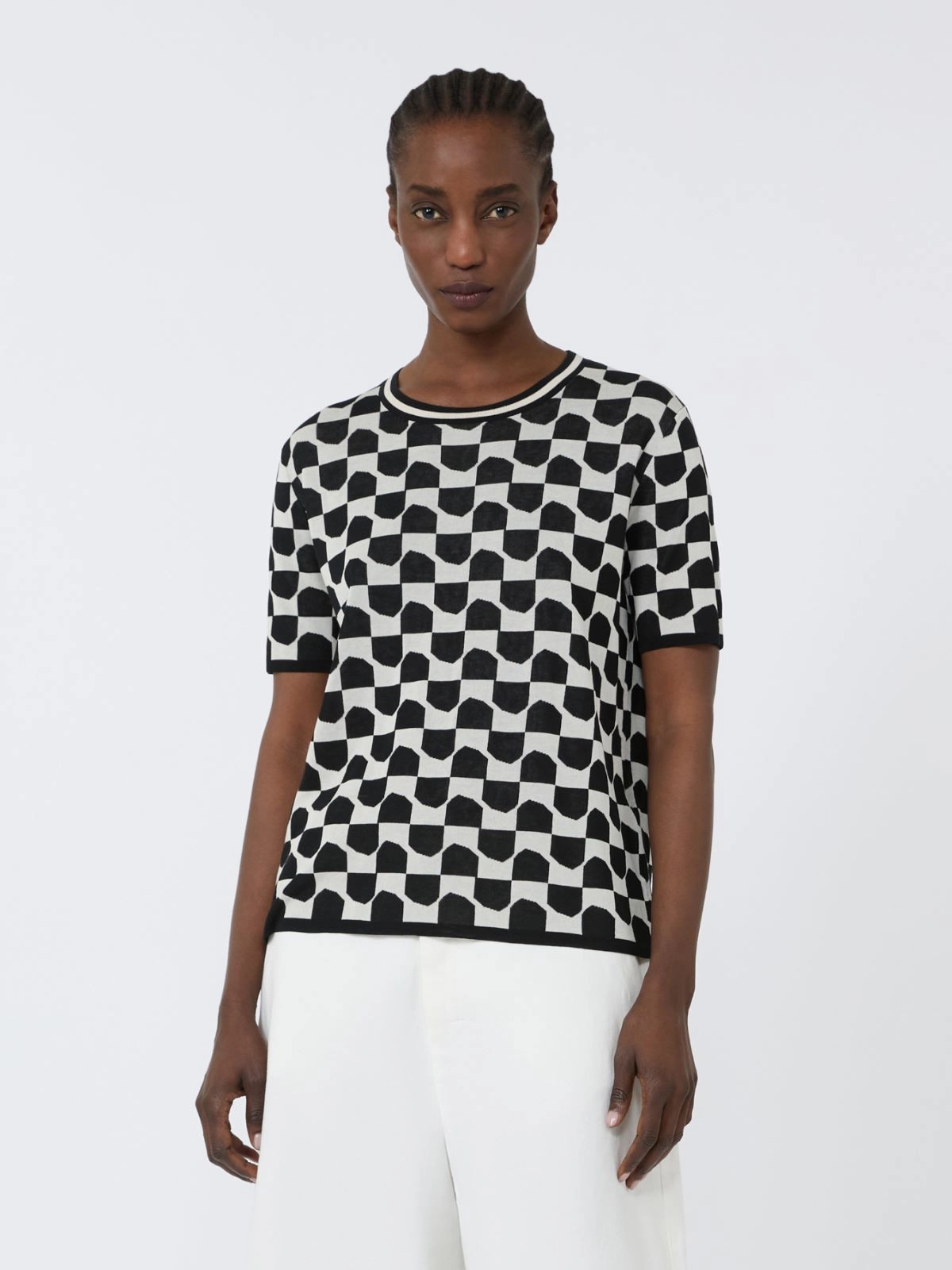 Maglia impreziosita da una lavorazione jacquard dal disegno geometrico.
